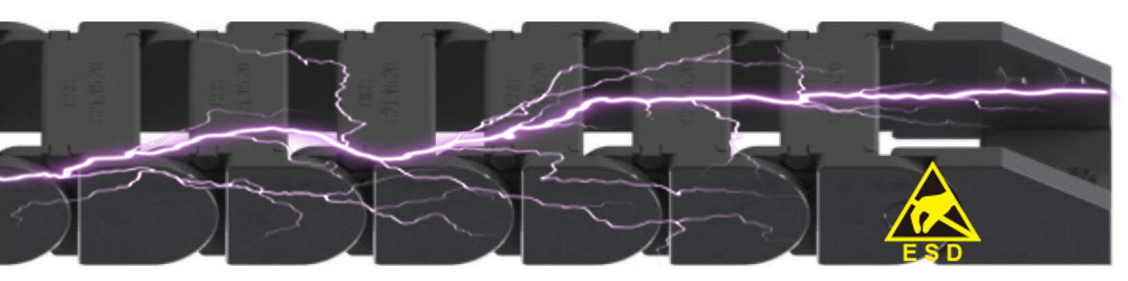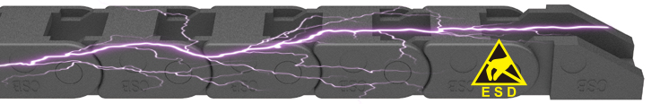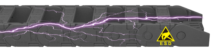 由導(dǎo)電ESD材料制成的EDS塑料電纜拖鏈用于避免電子自動化系統(tǒng)在移動過程中產(chǎn)生靜電。動端與固定端之間的表面電阻<10e9Ω。