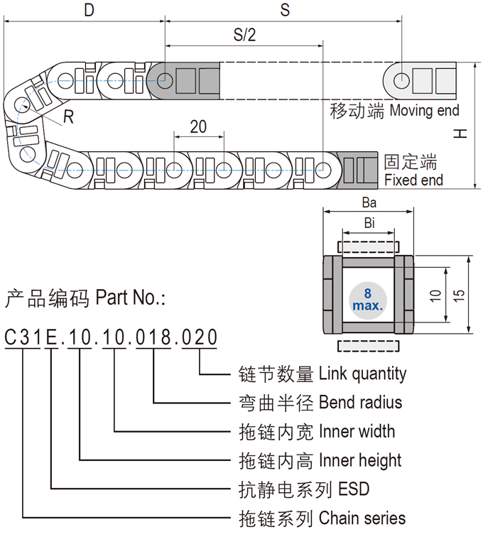 C31E.10抗靜電微型電纜拖鏈可沿內(nèi)側(cè)或外側(cè)打開,堅固耐用和多種打開方式設(shè)計,適用于高速運動。C31E.10抗靜電微型可打開電纜拖鏈適用于較小安裝空間,多種內(nèi)寬規(guī)格可選。