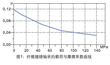 纏繞軸承的摩擦系數(shù)為0.03~0.12,影響摩擦系數(shù)的主要因 素有承載、運(yùn)動(dòng)方式、速度以及相配軸的表面粗糙度等。 圖1顯示了纏繞軸承在PV旋轉(zhuǎn)載荷下的摩擦系數(shù)隨著載荷的 升高而降低。
