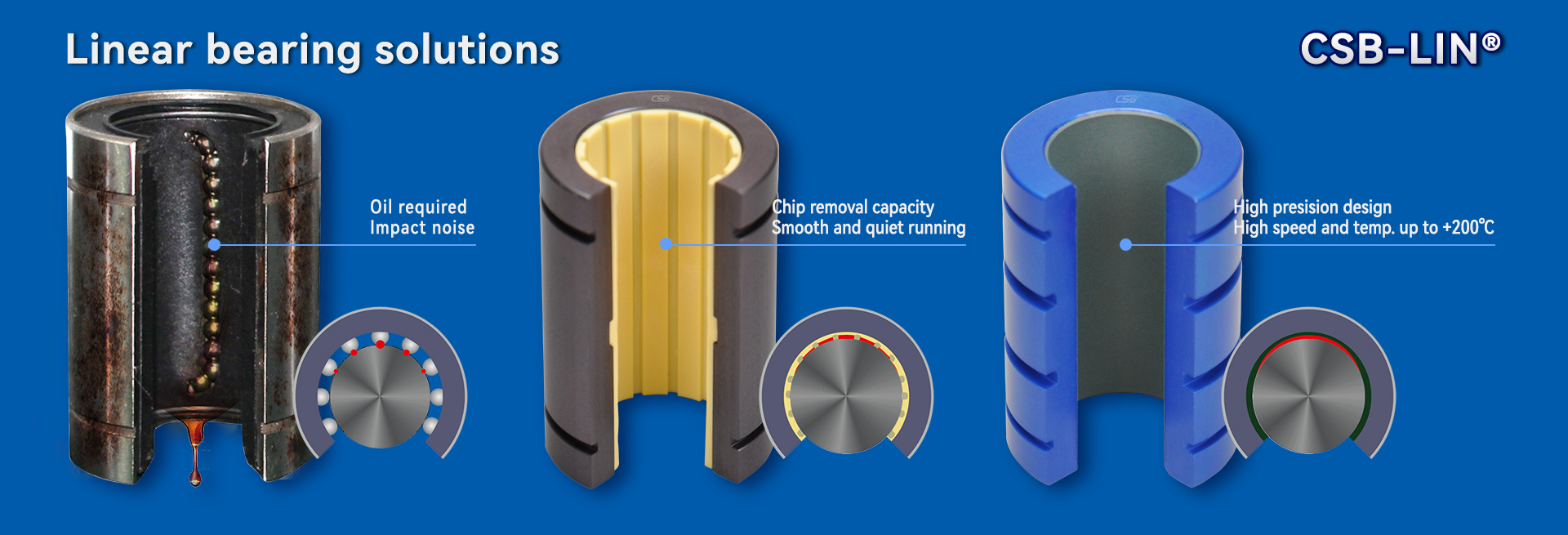 更多CSB-LIN?P精密直線軸承與金屬滾珠直線軸承尺寸精度一致,更高的承載能力且運(yùn)行噪音較低。耐磨層TEFPLAS?復(fù)合材料免維護(hù),低摩擦系數(shù),適用于高低溫±200℃運(yùn)行...