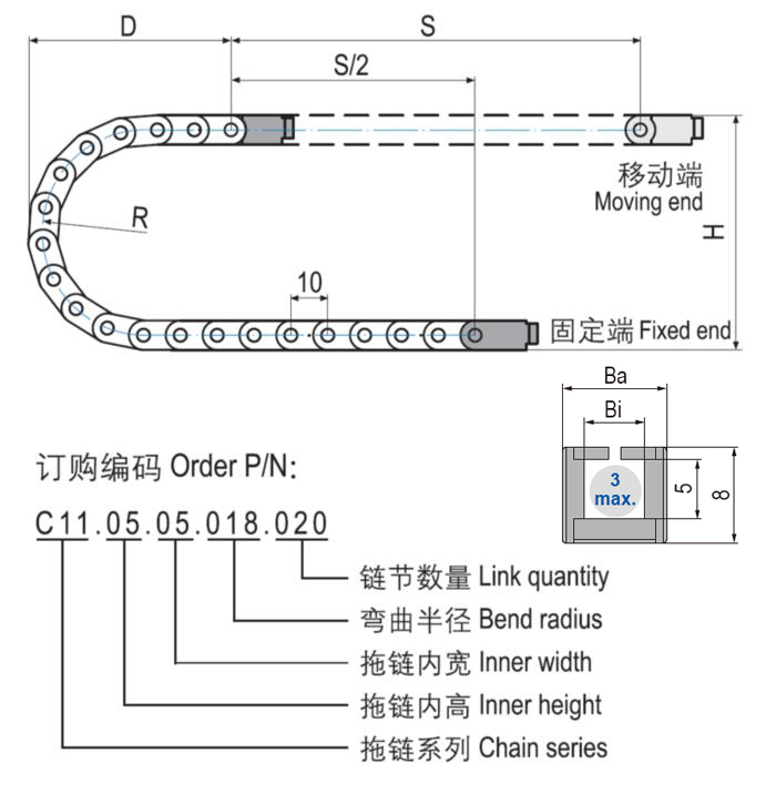 C11.05易填充微型塑料拖鏈體積極小,基于一片式開口設(shè)計重量輕且便于快速填充電纜,同樣適用于高速運動。C11.05微型塑料拖鏈適用于較小安裝空間,多種尺寸規(guī)格可選