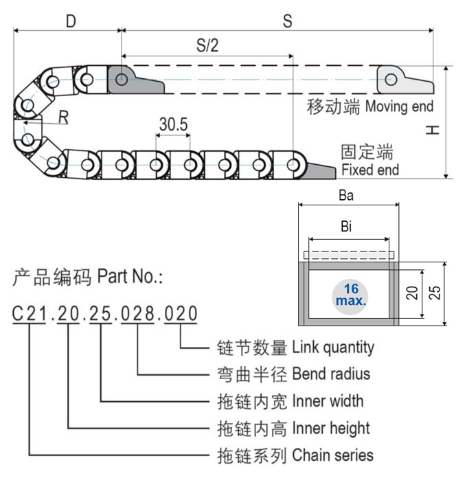 C21.20微型可打開式電纜拖鏈體積較小,基于兩片式設(shè)計重量輕特別適用于高速運動;C21.20微型電纜拖鏈適用于較小安裝空間,3種內(nèi)寬規(guī)格可選...