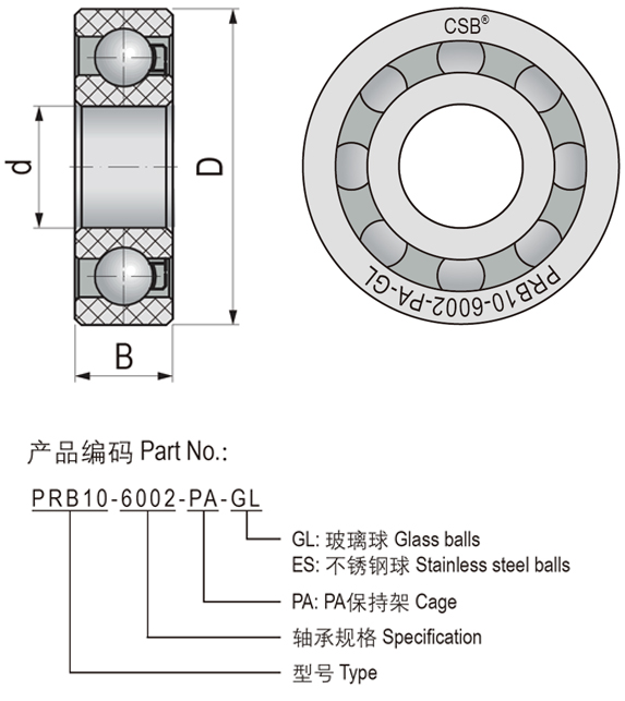 標(biāo)準(zhǔn)配置內(nèi)外圈材料:改良POM,保持架材料:改良PA,滾珠材料:玻璃-GL或不銹鋼-ES;