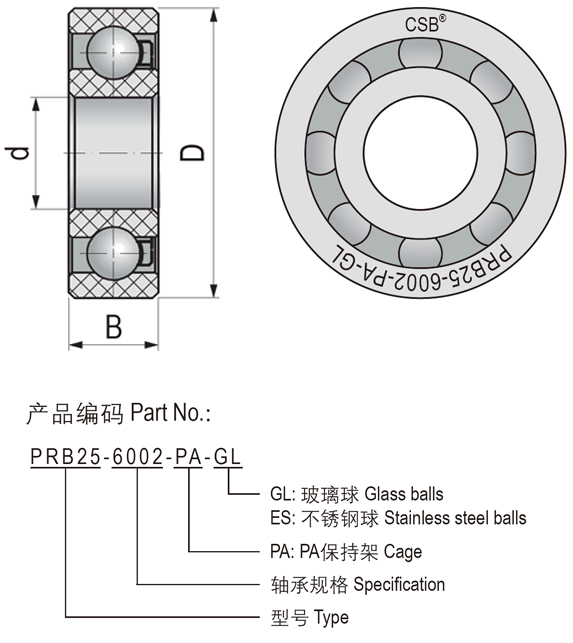 標(biāo)準(zhǔn)配置內(nèi)外圈材料:改良PA,保持架材料:改良PA,滾珠材料: 玻璃-GL或不銹鋼-ES;