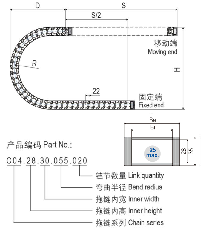 C04.28輕音型電纜拖鏈采用特殊具有專(zhuān)利結(jié)構(gòu)的轉(zhuǎn)動(dòng)連接設(shè)計(jì),消除了拖鏈運(yùn)動(dòng)中的撞擊噪音,且電纜拖鏈即使在高速運(yùn)動(dòng)中也能保持平穩(wěn)無(wú)振動(dòng).