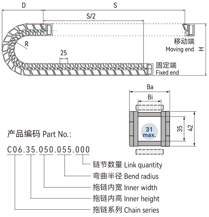 C06.35輕音型電纜拖鏈采用特殊結(jié)構(gòu)設計,使用壽命長;由于拖鏈采用圓弧外形設計以及短節(jié)距鏈節(jié)采用彈性元件連接降低了拖鏈彎轉(zhuǎn)過程中的振動,適合低噪音、高速與無塵室應用。